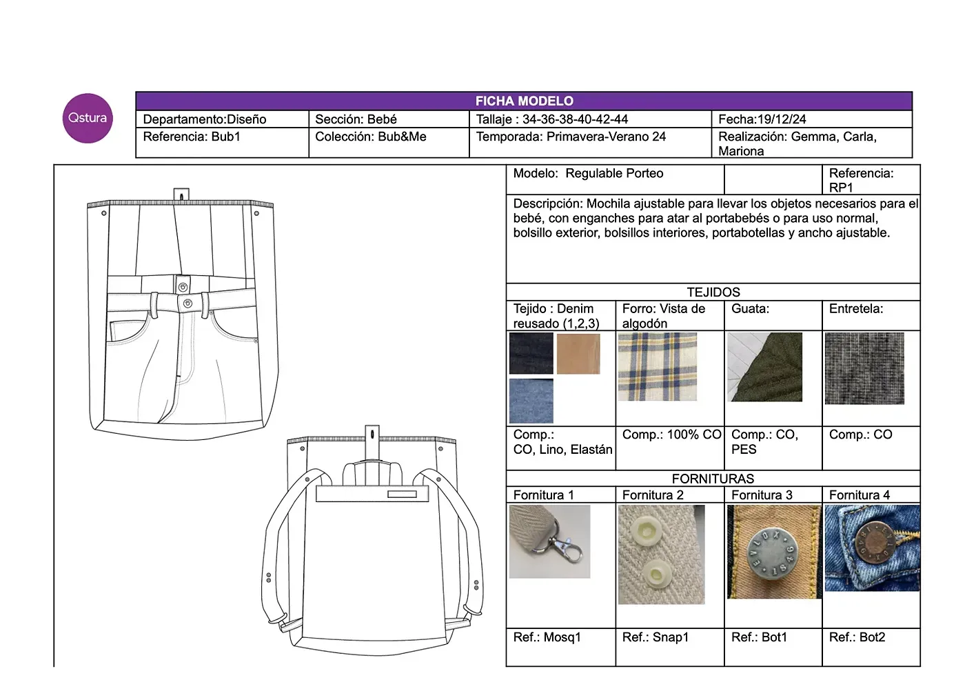 L’objectiu és crear una motxilla per mares amb molta capacitat i que es pugui adaptar a una motxilla portabebés, tot intentant minimitzar l’ús de materials que no provinguin de peces donades. És per això que s’han reutilitzat gran part dels components, com els botons dels pantalons, i les cintes ajustables que regulen la mida de la motxilla.