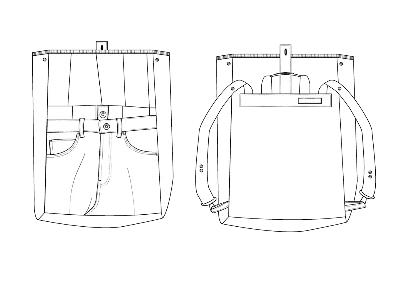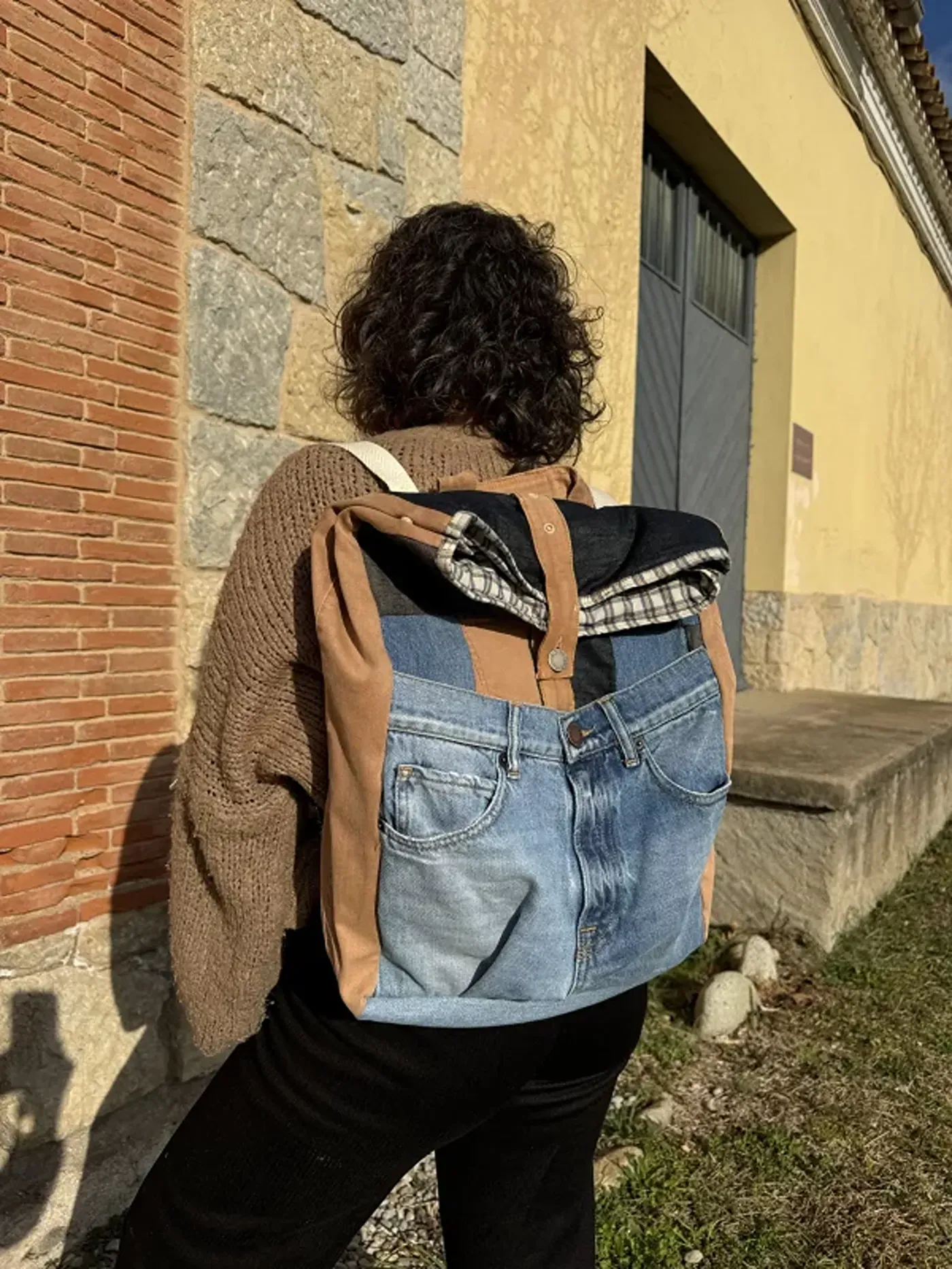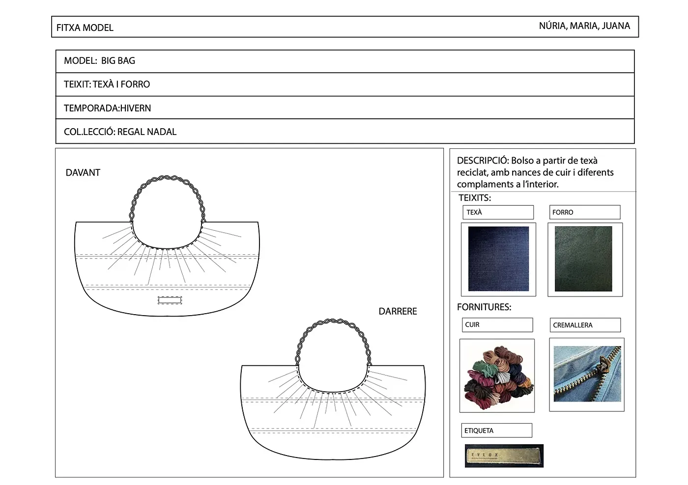 Inspirades per les bosses de mà d’Inditex, creen la idea de realitzar un complement estilós però de tamany més gran per a donar-li més utilitat en el dia a dia. Hi afegeixen butxaques als laterals, així com retalls esparracats dels pantalons originals per donar-li un toc més urbà i juvenil.