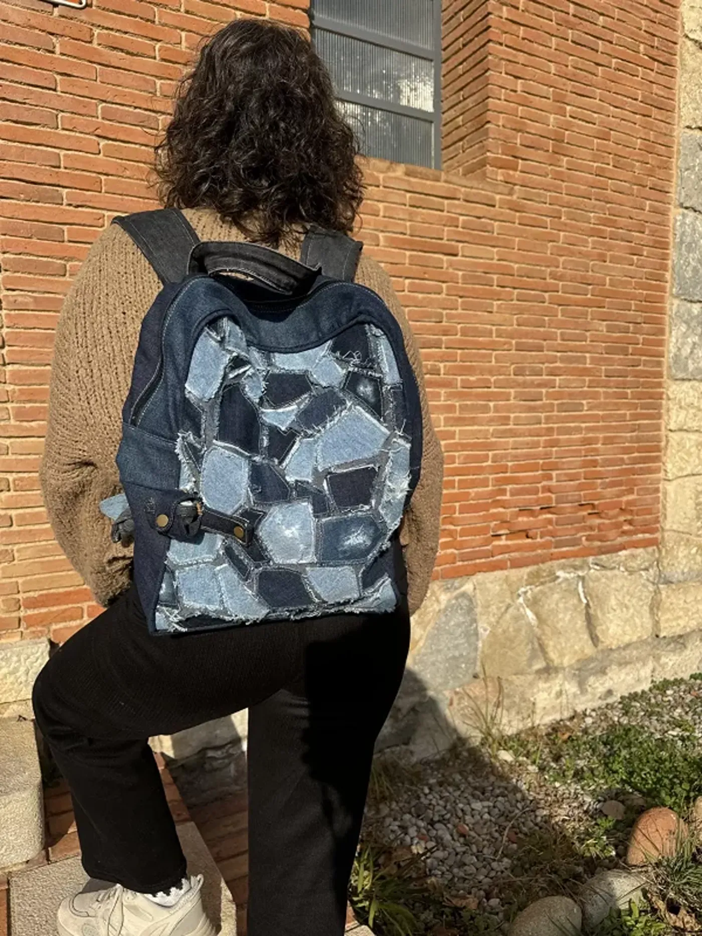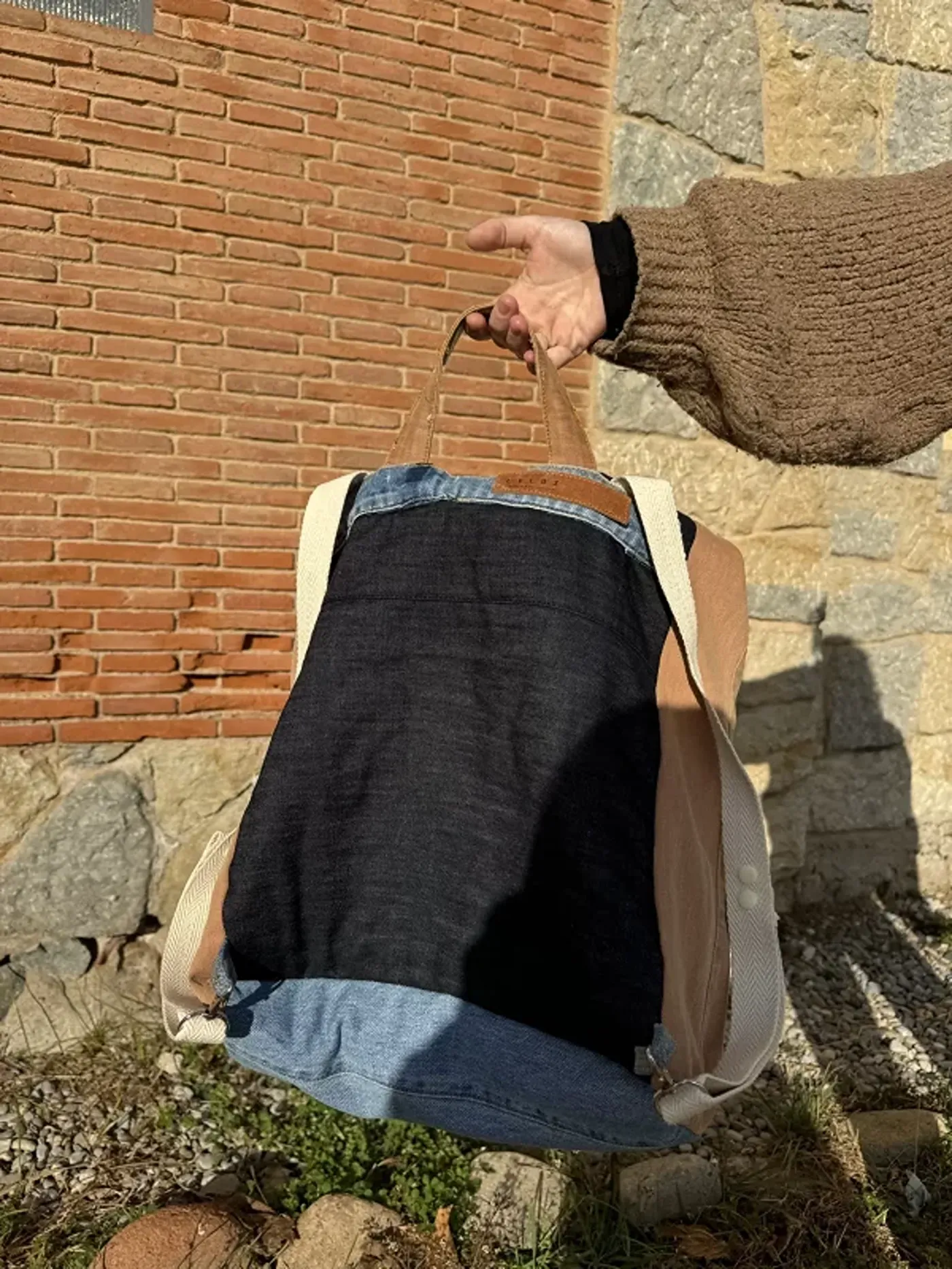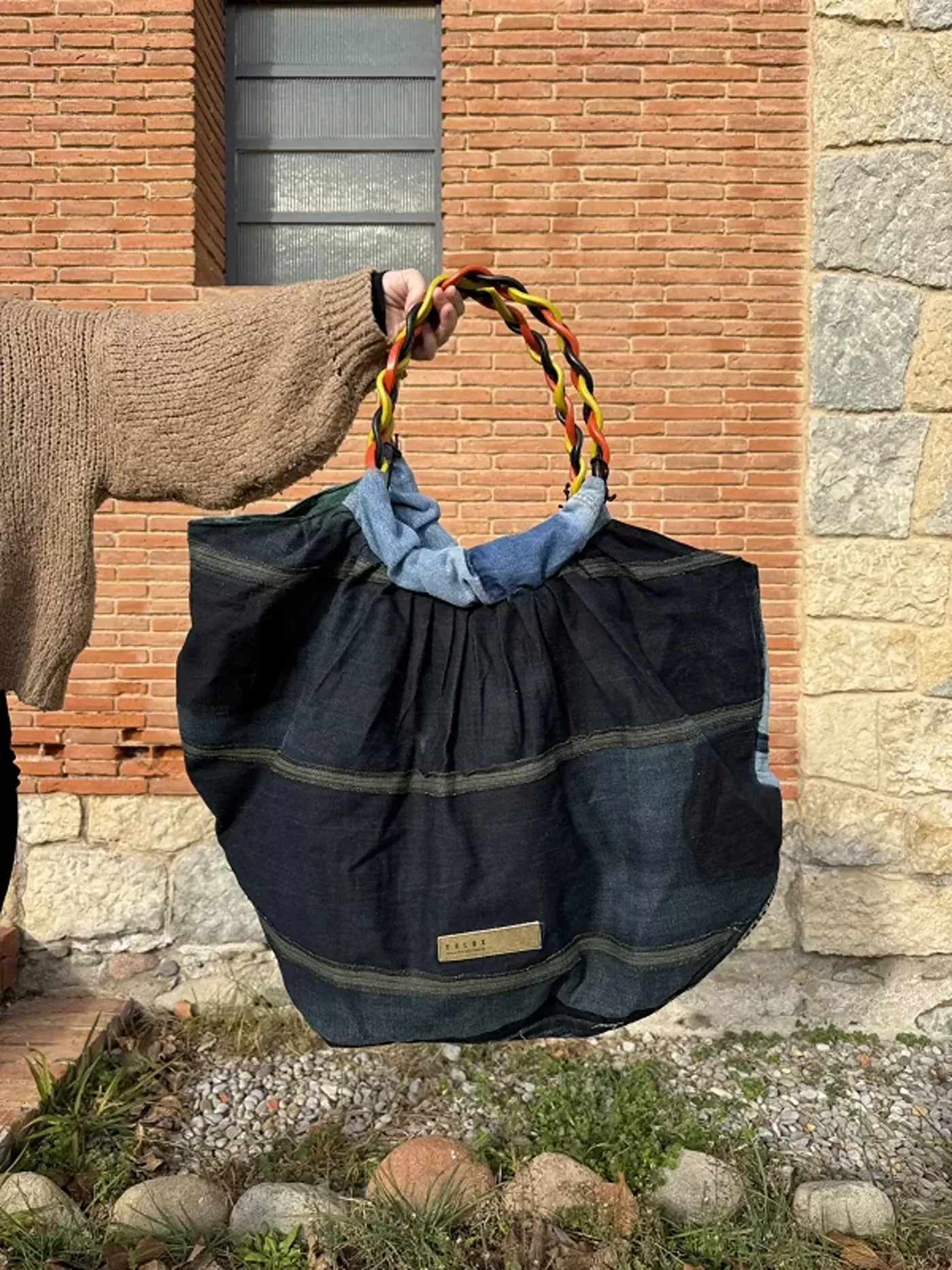 Per confeccionar la bossa de mà s’han fet servir dos denim. Un d’ells s’ha manipulat i decolorat, i l’altre s’ha deixat intacte, de color blau elèctric. Amb l’objectiu de donar-li un look més actual i modern, s’ha fet encoixinat. D’aquesta manera se li pot donar un doble ús, ja que serveix com a coixí per a les persones que commuten en el seu dia a dia sigui en tren o autobús.